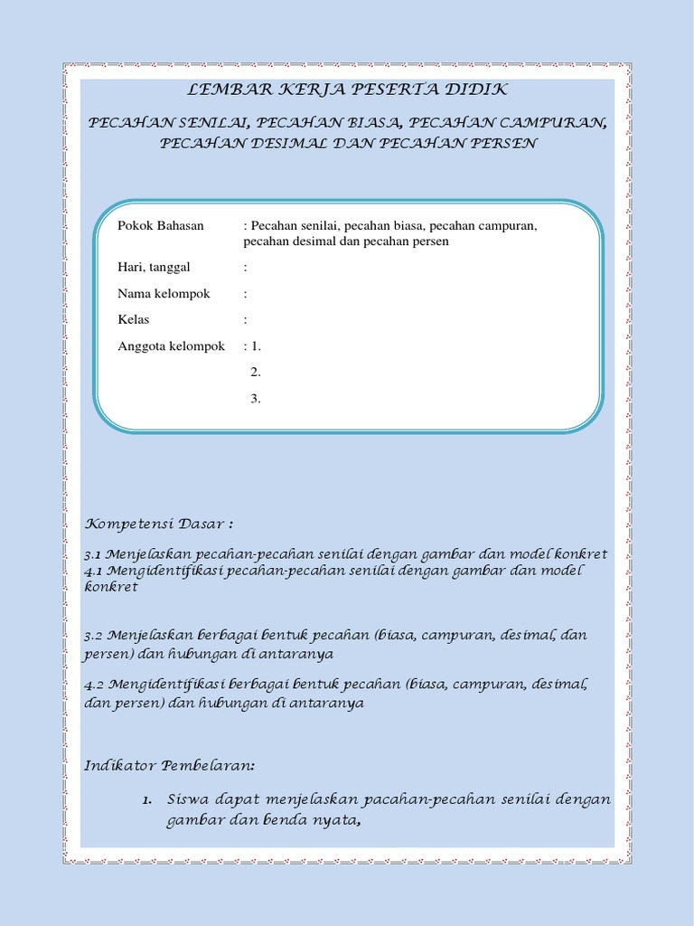 Kumpulan Soal Mengurutkan Pecahan Kelas 4 Sd Doc Kuncisoal from assets.pikiran-rakyat.com Sahabat matematika dasar yang selalu bersemangat dan selalu ceria, materi pecahan di kelas 4 sd dibagi lagi menjadi beberapa sub penggalan yakni : Jumlah siswa kelas 4 sd jaya adalah 50 orang. Dilengkapi dengan contoh latihan soal untuk menguji kemampuan pemahaman peserta didik dalam penguasaan materi megubah bentuk pecahan. Pecahan sendiri dibagi menjadi tiga jenis yaitu pecahan biasa, pecahan campuran, satu lagi adalah pecahan desimal. Satu bambu dipotong menjadi 5 bagian sama panjang. 68%(25)68% found this document useful (25 votes). Upaya meningkatkan kemampuan komunikasi matematika siswa kelas iv sd negeri sekaran 2 pada materi pokok kelipatan persekutuan terkecil (kpk) dan pecahan dengan menggunakan pembelajaran kurikulum berbasis kompetensi (kbk). B satu buah apel dipotong menjadi 2 bagian sama besar.